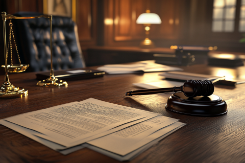Create a photorealistic scene of a legal desk with a judge's gavel on legal documents and a fountain pen. The scales of justice are softly lit in the background, giving the scene a warm, professional, and authoritative atmosphere. --ar 3:2 --v 6.1