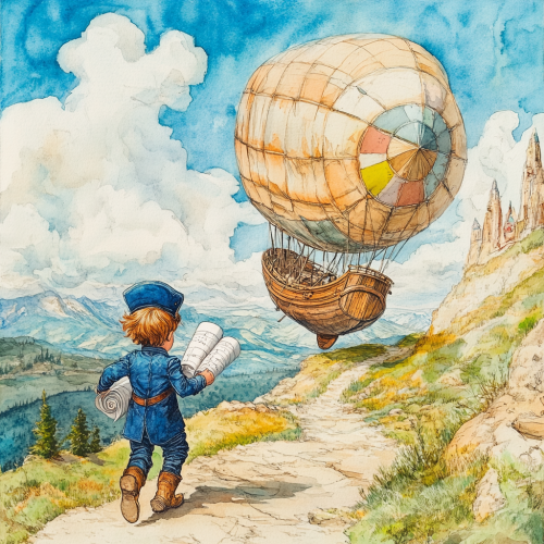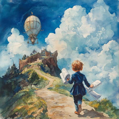 An image of a little boy in a blue velvet 19th century play suit running down a hill, with rolled up blueprints and maps under his arm, towards an airship that is docked on the side of a mountain. Beautiful blue sky, lots of white fluffy clouds. Watercolor style.