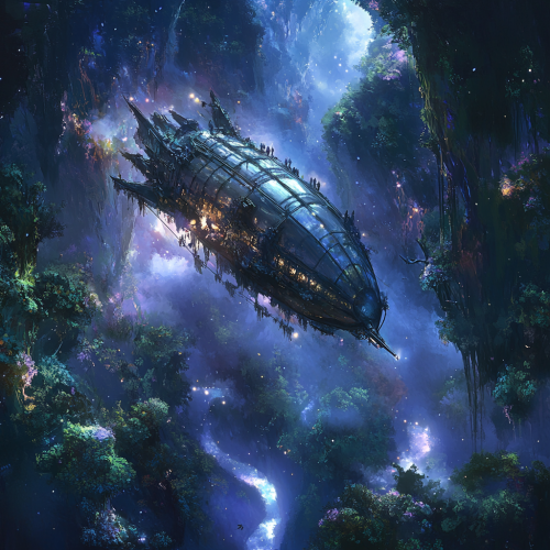 Epic fantasy image of wooden airship flying through misty clouds, in style of Moebius and Alphonse Mucha, epic fantasy art, high saturation, very detailed --v 6.1 --ar 9:16