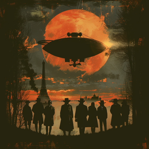 a simple-shaped kid-drawn silhouette of an airship flying in front of the sun and over a group of individuals wearing 1899 bérets as in Peaky Blinders, standing next to each other as characters wearing long coats, shirt and suspenders, on a cinematic Star Wars stylized poster image, darkness and lightness, no details, faces cannot be seen because of the shadow of their own silhouettes, extreme contrast with the bright light coming from behind, in the background the silhouette of the Eiffel Tower and stylized mix of 1919 transsiberian train, train station under the snow, aviation hangar in the forest, old parisian horse cabs, fog, clouds, Eiffel Tower and haussmannian rooftops in the background, bright round sun, scene taken at down with the sun low on the horizon, play with color contrast, shades of yellow red and green, light and darkness to conveil a sense of mystery, adventure and epicness --v 6.0 --style raw