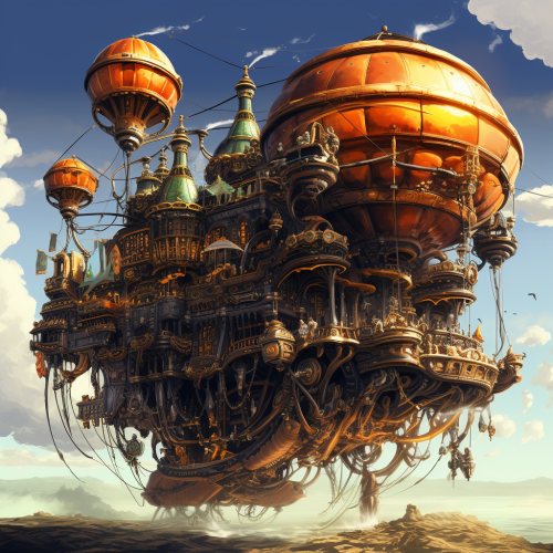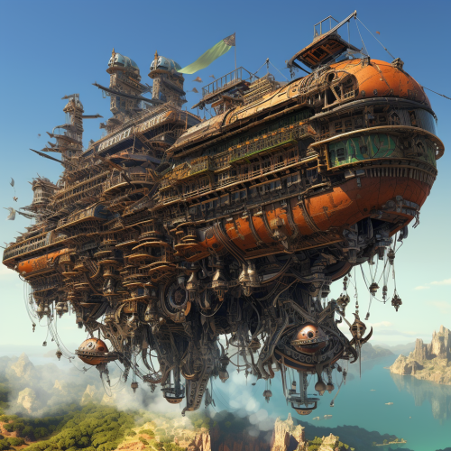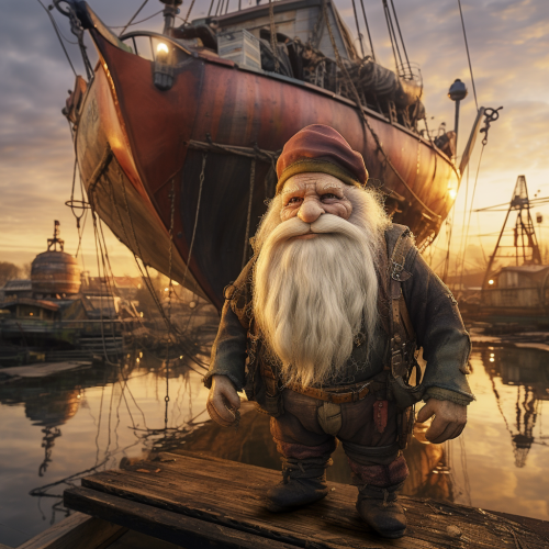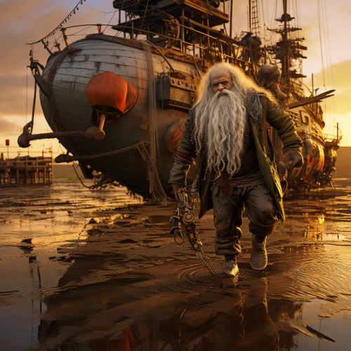 fantasy Airship Engineers gnome 78 years old in a dock yard pulling a muddy airship out of the water sunset epic