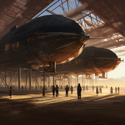 A large Hanger housing several Airships. There is cargo laying around. Soldiers moving about.