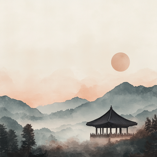 A mysterious and enchanting East Asian night scene inspired by poetic imagery, depicted in a soft pastel color palette. The scene is rendered in the style of Kim Hong-do (Danwon) with traditional Joseon dynasty painting techniques. The pastel-toned sky is calm and serene, with no moon visible, adding to the tranquility. Wispy clouds blend softly into the sky, creating a dreamlike atmosphere. Silhouettes of distant mountains and a traditional Joseon-era pavilion (jeongja) are visible, illustrated in delicate, muted pastel ink-wash brushstrokes. The warm tones are softened to beige hues, blending gently with the scene, while cool pastel blues evoke a serene breeze. The composition captures a tranquil, mystical Eastern beauty in a 16:9 aspect ratio.