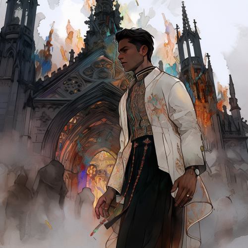 close-up, male filipino pinoy priest walking past a gothic cathedral, holding a smoldering censer, foreboding, inspired by kj apa tom daley adam rippon, colored inks style, style of luis royo, leonid afremov, mike zeck, edgard maxence, mondrian --niji 5