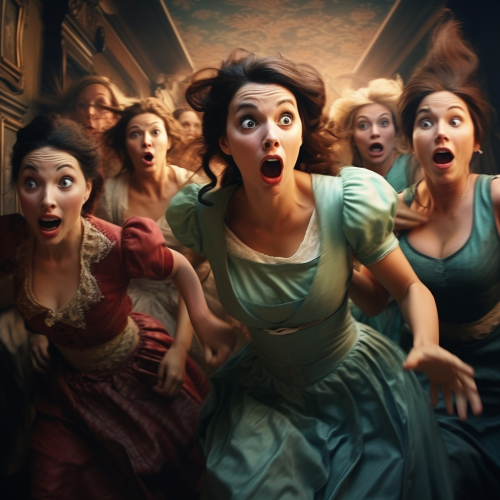 a large group of exited ladies coming towards you/the camera, trying to grab you