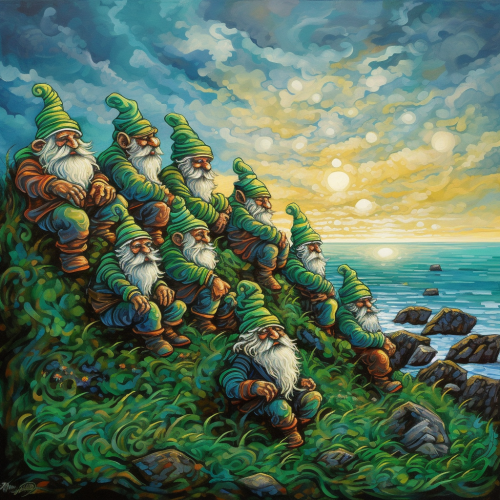 several leprechauns, grassy knoll, party, bright sky, Ireland, style Keebler Elf, detailed, --seed 484947 --s 250 --v 5.0