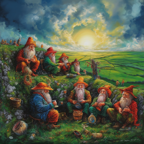 several leprechauns, grassy knoll, party, bright sky, Ireland, style Keebler Elf, detailed, --seed 484947 --s 250 --v 5.0
