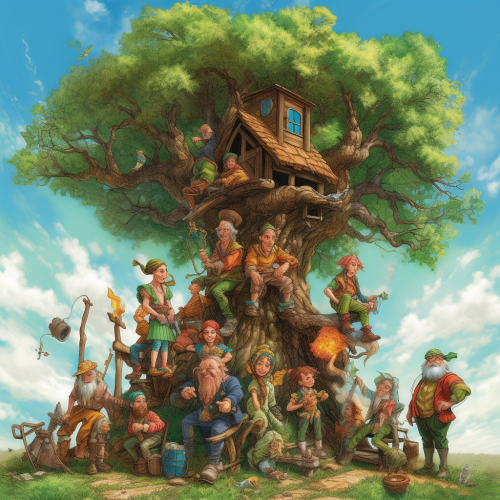 several leprechauns, hollow tree, party, bright sky, Ireland, style Keebler Elf, detailed, --weird 800 --s 250 --v 5.0