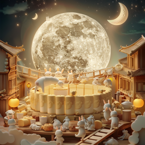 During the Mid-Autumn Festival, there is a round moon in the night sky. Inside a huge round moon cake are many little rabbits making moon cakes on the assembly line. Some rabbits are on the conveyor belt, some rabbits are climbing stairs, and some rabbits are transporting raw materials. Cartoon realistic scene , illustration style, warm atmosphere and colors, focus composition. --v 6.0