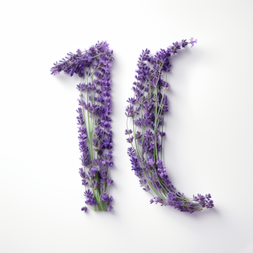 the letter "I" spelled out with lavender plants on a fresh white surface.
