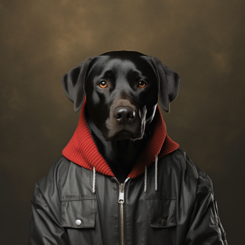 A photo realistic black lab dressed as Run DMC shot in the style of Wes Anderson