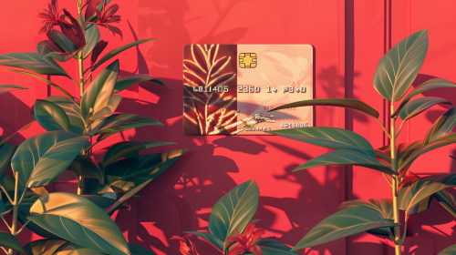 a credit card on a red backdrop with plants around; photorealistic, Wes Anderson --ar 16:9