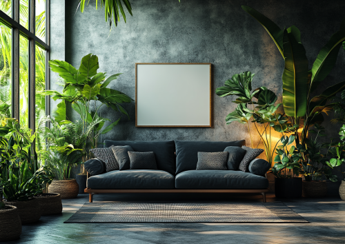 high quality real photo. there are the dark sofa and lots of plants with empty framed board on the wall. board is white color i . wall is gray --ar 7:5 --s 750