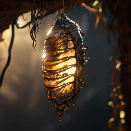 "Create a poetic and cinematic scene featuring a chrysalis engulfed in soft, glowing flames. The flames illuminate the intricate details of the chrysalis as it transforms into a butterfly. Capture the delicate emergence of butterfly wings from the fiery cocoon, symbolizing rebirth and freedom. The background should be an ethereal landscape with warm, dreamy colors blending harmoniously, enhancing the magical atmosphere. Add subtle sparks and embers drifting in the air, evoking a sense of wonder and transformation." Feel free to adjust any part of it to better fit your vision!