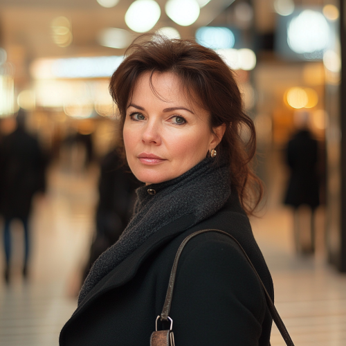create an image of middle age woman, hyper-realistic photography, 42 years old, she is a married woman with 2 kids, well-organized, she likes comfort, elegancne, shopping in mall, she is buying luxury accessories, she is looking like woman in her fourties