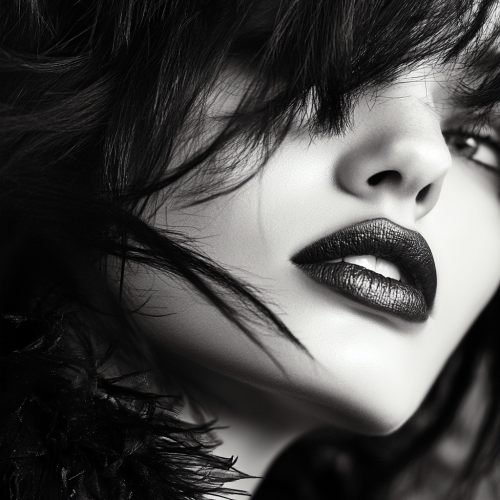 Ein Cover für ein Lifeytyle magazine, dass eine Frau mittleren Alters mit mittellangen schwarzen Haaren zeigt, Style ist High Fashion, black and white