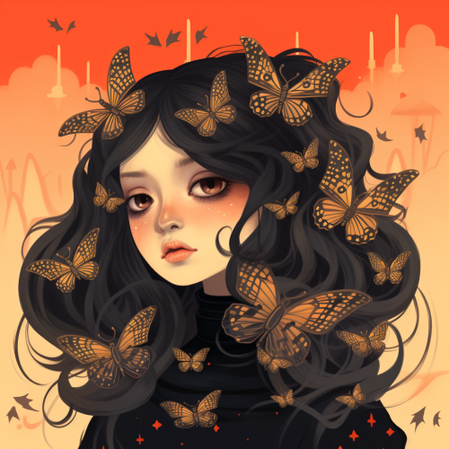 Handdraw Procreate stamp brush illustration , beautiful moth woman, black long hair and big red eyes, pale skin, wearing simple black dress, moths around her, Halloween contest, character design, linework, autumnal colors, gold decorations, soft background