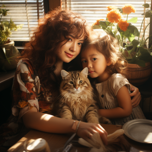 Photo in the light botanical room, two Asian lesbian couple and a Amerasian child with blue eyes and golden curly hair they hug with each others, a cat lying on the table, shot on kodak Ektachrom 100 plus, the sun shining, movie shot, film texture, Medium Long Shot, realistic photography, surreal, high detail, 4K--ar 3:4 --s 750