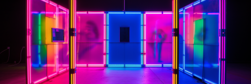 square photo booth with colored neon lights in an environment with black light and colored lights blue, orange, pink and green, --ar 9:3