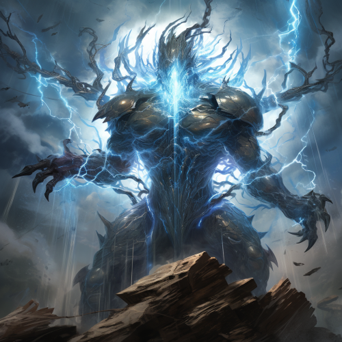 Lightning Golem, Made of Metal, Constructed, Muscular Frame, Blue Energy, Glowing Eyes, Ultra Detailed