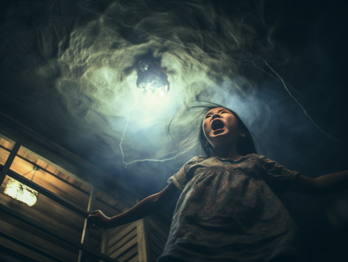 filipina girl possessed on the ceiling , mouth open, bedroom background, eerie, distressed, lightning effect, ghost photography, asian horror movie, horror movie special effects, cinematic, vintage, --ar 4:3