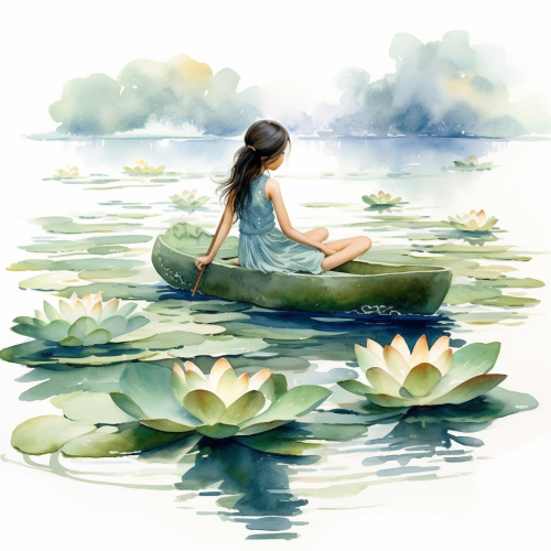 **a girl on a water lily on a water, side view, book illustration, watercolour illustration, children books,