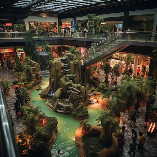 symmetrical arial shot, abandoned mall hall with waterfall in the center, post-apocalypse, dirty floor with damage, retrowave lighting with purpe and blue, palms in the hall --ar 9:16 --v 5.2