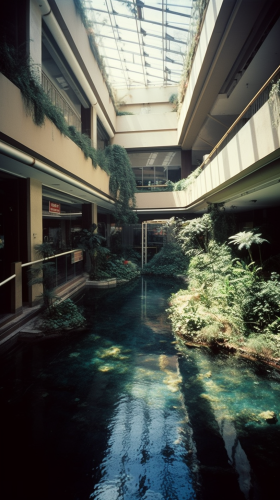 empty 1980s liminal vaporwave aquarium mall. canal city hakata. waterfall in the middle. sunlight from the roof shining in. pastel coloured walls. no one is around. with fuji velvia color slide film, cinematic, Leica MP camera, Leica 35mm lens, f/1.4, features, hyperrealist photography, clean sharp focus, accent lighting, analogue photography, fashion High-sharpness, Christian Riese Lassen style, 8k --ar 9:16 --s 750 --v 5.0