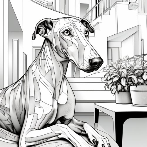 line art coloring pages for adults, A majestic greyhound laying inside a modern house,white and black, crisp and thin lines,no shading, no greyscale,low details,- - ar 2:3, - - s 750, - - v5