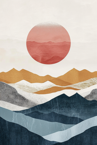 line art, boho style, soft pastel colours, water colour, sun and mountains simple art poster --ar 2:3 --v 6.0
