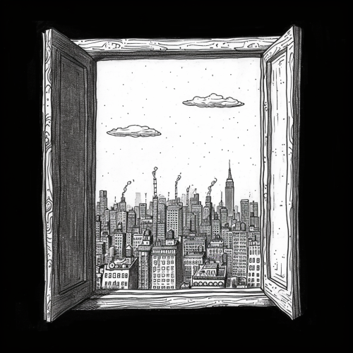 Fineline cartoon tattoo sketch in black ink. A first person perspective looking out an open window with a simple panel border drawn in slender lines. In the distance is a minimal cityscape depicted in basic fineline outlines and tiny dots suggesting buildings, a spaceship, and abstract signs of pollution rising from stick-figure chimneys --v 6.0 --s 250