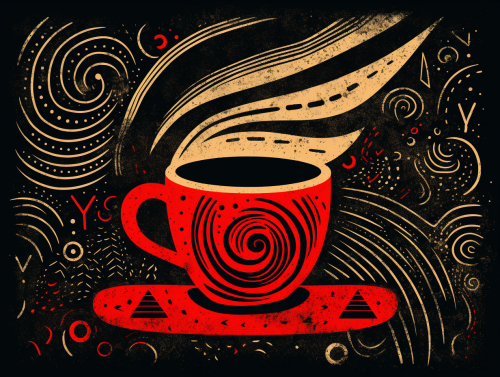 abstract linocut art, a laptop and a coffee cup, red beige black, mysterious symbols and shapes, grunge texture, editorial illustration --ar 4:3 --v 5.2