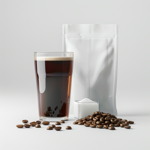 Mockup of a coffee brand identity, glass of coffee and packet of sugar, with coffee beans on the side. Product must be presented in the spotlight and photographed with an 80MP Mamiya Leaf Credo digital back. realistic photo, white background
