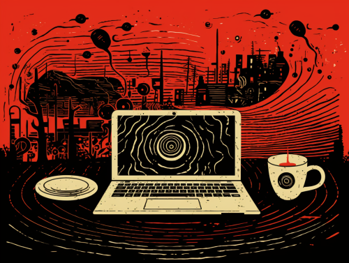 abstract linocut art, a laptop and a coffee cup, red beige black, mysterious symbols and shapes, grunge texture, editorial illustration --ar 4:3 --v 5.2