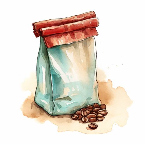 A watercolor illustration of single Coffee Bag, Coffee illustrations, vintage colors brown and beige light green and light blue and red colour, hand drawn style, clipart, white background --v 5.2