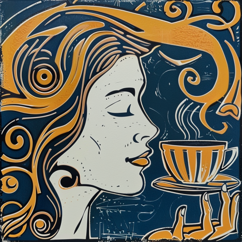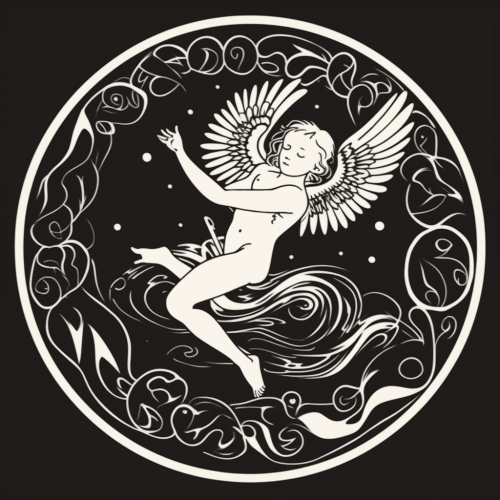 Vintage linocut of cupido flying around in love. Around him there is a glow of light. Simple style. Not too many details. 1 color. Black background. Oval shaped. --v 5.0