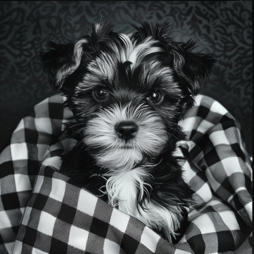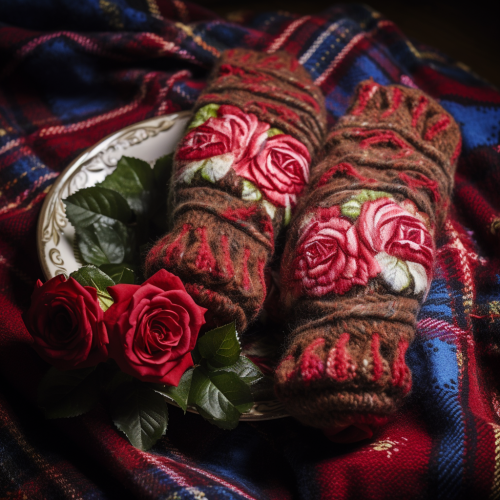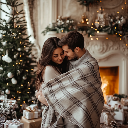 A photo of a couple wrapped in an elegant plaid blanket, the blanket's background is grey color with white lines, sharing affectionate moments in the style of the fireplace and Christmas tree. The room is decorated with festive decorations, creating a cozy atmosphere perfect for Christmas celebration. In front, there are some gifts on the table.