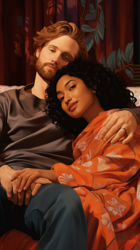a man and a woman of different ethnicities, in relaxing clothes, cuddling on a couch with the woman wrapped in a blanket --ar 9:16