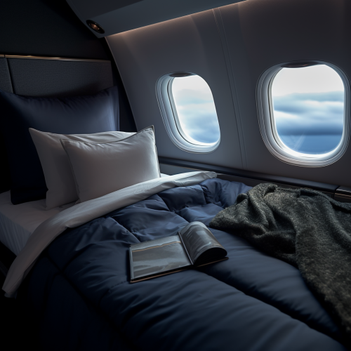 first class plane flight small private bed. The bed is made perfectly with a dark gray blanket, navy blue sheet and two white pillows. Next to the bed are two plane circular windows. Behind the pillows is a black soft headboard. No side view. Point of view is from the horizontal direct center and low. The window looks out to a dark sky. It is dark in the sleeping area.