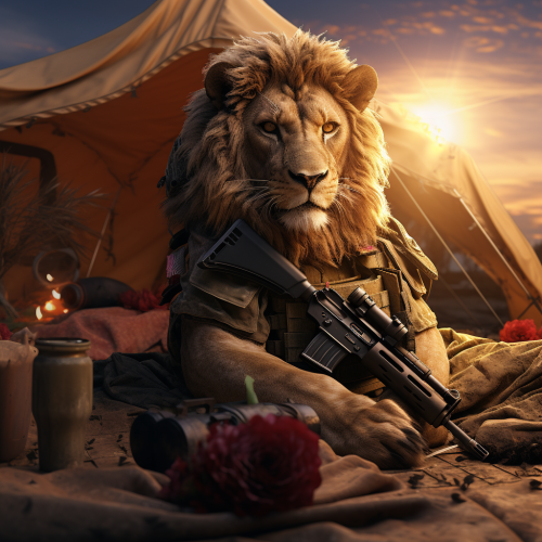 lion holding m249 in a tent, wearing CAG uniform, 8k, unreal5, high render, realistic, sunset lighting