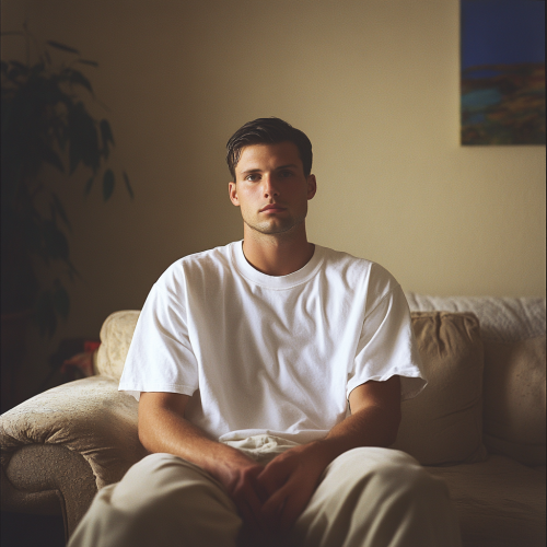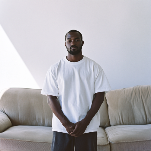 a realistic black model man and using white oversized tshirt, high quality tshirt, the backgorund is white , shot with kodak portra 400 film, the camera shoot from front, the man is standing behind a sofa