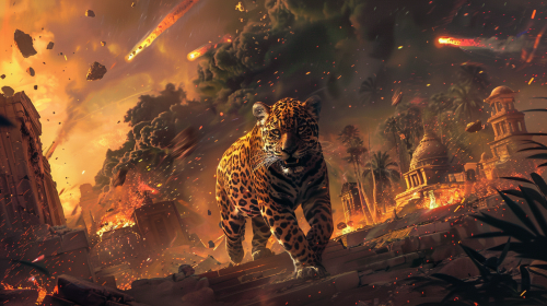 colorful realistic detailed drawing, close-up of a black leopard cub with multi-colored spots sitting on a stone cliff at night, bright flowers at his paws, the moon in the background
