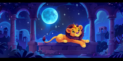 Cartoon illustration style depicts a world full of love and warmth. The exciting bright moon hangs in the dark blue-purple sky, and there is a mysterious palace under the moonlight. a lion cub wears a crown and sits on the throne of the palace, with a rich and cute expression. The palace's arches and Roman columns surround the lions, adding a tranquil and solemn melody. --ar 2:1 --v 6.0 --stylize 250