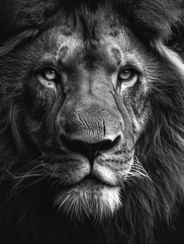 black and white realistic lion with lighting over face looking into the camera,wide angle --ar 3:4 --v 6.0 --s 750 --style raw