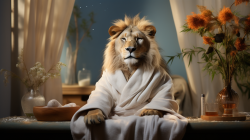 happy lion in a bathrobe, relaxing in a spa. The lion should be seated with its legs crossed in a relaxed and comfortable manner. Please use warm, soothing colors to enhance the tranquil mood of the spa. Ensure that the lion's expression is calm and content, reflecting its relaxation in the spa environment. Feel free to add any spa-related details like towels, candles, or spa furniture to enhance the overall atmosphere. --ar 16:9 --stop 90 --s 250