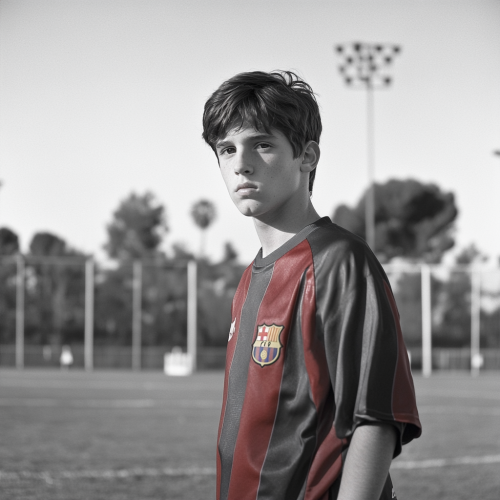 lionel messi as a teenager around 15 years old, slightly taller but still slender, with the beginnings of a serious look in his eyes. He’s wearing the FC Barcelona youth team kit, with shin guards and soccer cleats. His hair is a bit longer and more styled, and he has a focused, driven expression as he stands on a soccer field, ready to take on the world.