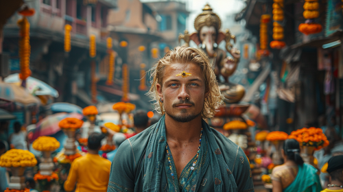 Erling Haaland, Norwegian football player, standing on the vibrant streets of India during the Ganesh Chaturthi festival. He is wearing traditional Indian attire (a deep green sherwani with intricate gold detailing), with his signature blonde hair tied back and an athletic build, giving a slight smile and looking directly at the camera. Behind him, a large Ganesh statue decorated with colourful flowers and lights, surrounded by people joyfully celebrating the festival. The atmosphere is festive, colourful, and culturally rich --ar 16:9 --v 6.0 --style raw --s 750