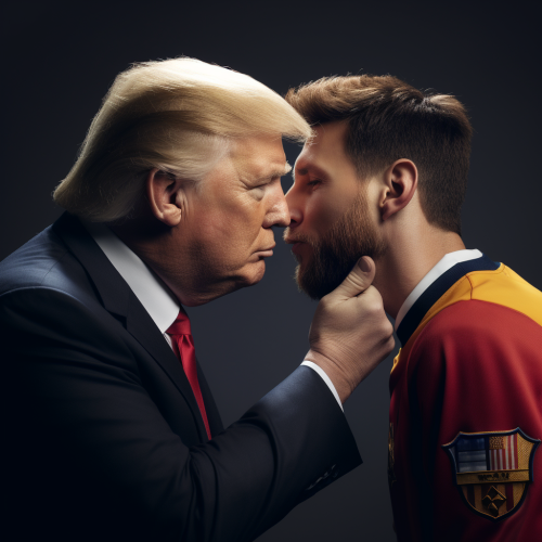 Lionel Messi is dribbling past the lions that surround him. Surrounded by the atmosphere of a football field people cheering In an atmosphere of intense fighting colorful sky 8k, --ar 16:9
