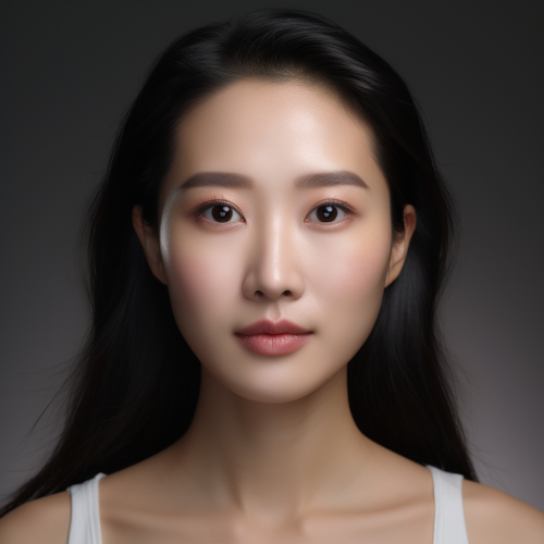 A asian Woman with a Fresh and Soft Makeup Look, closed mouth, frontal face, lip gloss, studio lighting, blank background, 8k