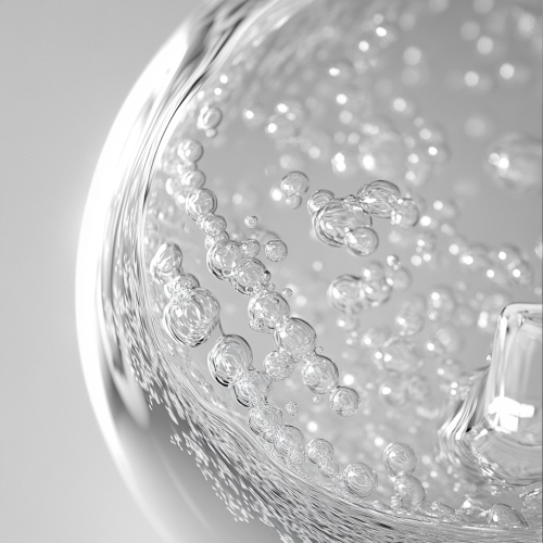 Create a high-resolution, molecular-level close-up image of a transparent, colorless toner with delicate, translucent bubbles. Focus on the detailed structure of a single bubble containing tiny, barely visible brightening capsules. The entire scene should be clear and free from color, emphasizing purity and simplicity. Lighting should softly highlight the glossy, glass-like surfaces of the bubbles and capsules, showcasing intricate transparency and fine texture without introducing any color.